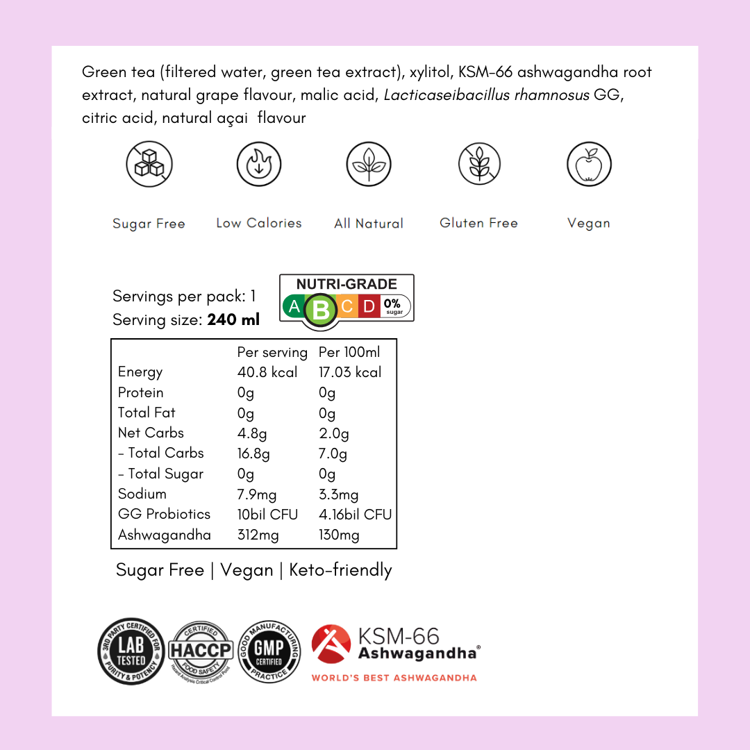 Green tea (filtered water, green tea extract), xylitol, KSM-66 ashwagandha root extract, natural lychee flavour, malic acid, Lacticaseibacillus rhamnosus GG, citric acid, natural rose flavour