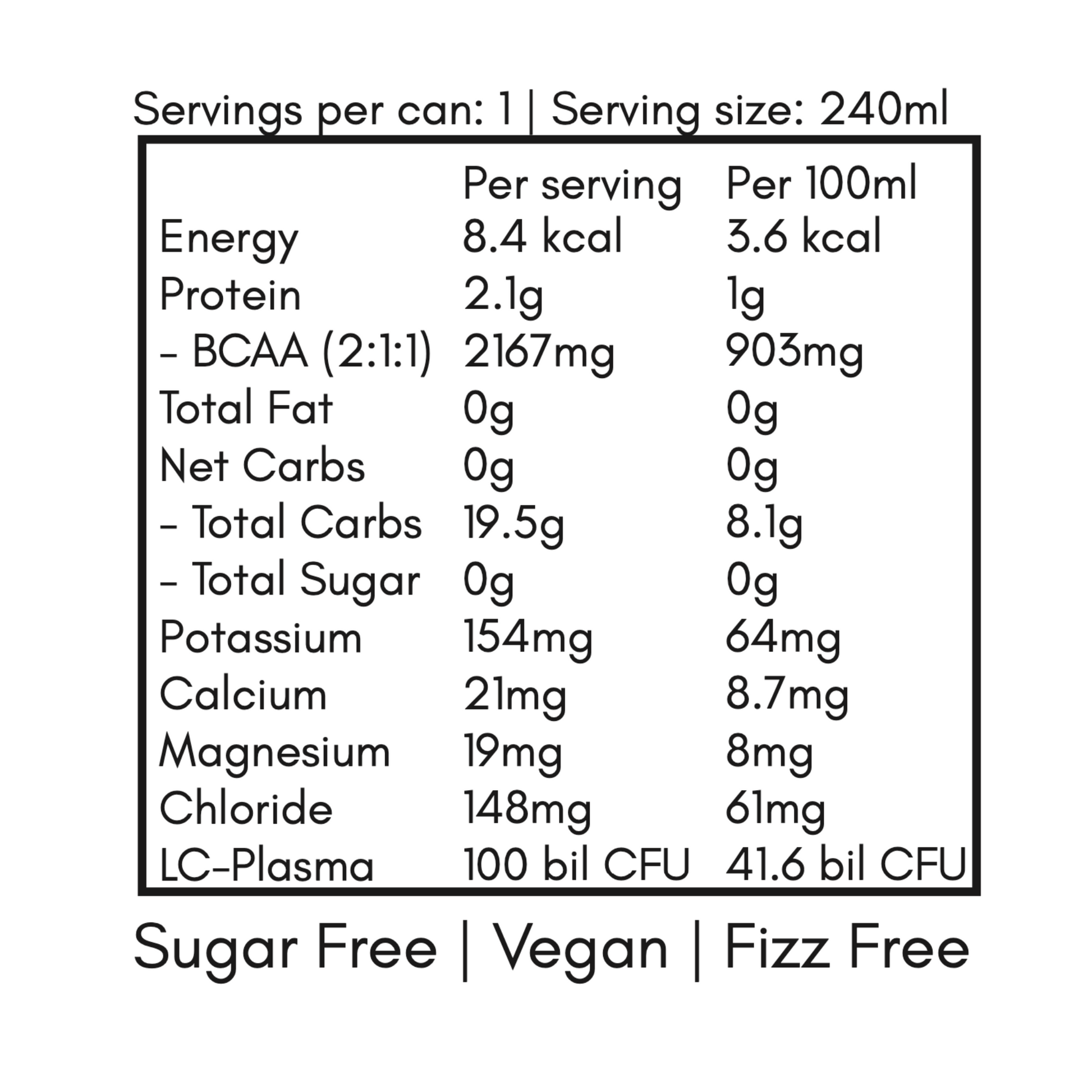 Green tea (filtered water, green tea extract), erythritol, BCAA (L-Leucine, L-Valine, L-Isoleucine), citric acid, vitamin C (ascorbic acid), electrolytes (potassium chloride, magnesium citrate, calcium citrate), monk fruit extract, natural citrus flavour, postbiotics LC-Plasma