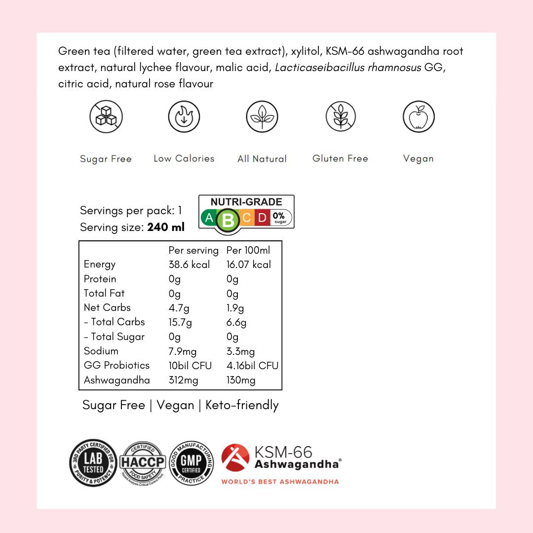 Green tea (filtered water, green tea extract), xylitol, KSM-66 ashwagandha root extract, natural lychee flavour, malic acid, Lacticaseibacillus rhamnosus GG, citric acid, natural rose flavour
