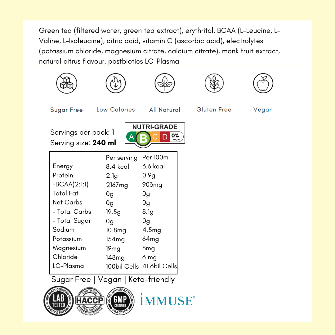 Green tea (filtered water, green tea extract), erythritol, BCAA (L-Leucine, L-Valine, L-Isoleucine), citric acid, vitamin C (ascorbic acid), electrolytes (potassium chloride, magnesium citrate, calcium citrate), monk fruit extract, natural citrus flavour, postbiotics LC-Plasma